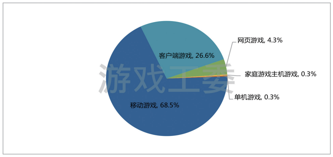 2019年,移動遊戲市場實現營收1581.1億元,佔比68.5%;客户端遊戲市場實現營收615.1 億元,佔比 26.6%;網頁遊戲市場實現營收98.7億元,佔比 4.3%。