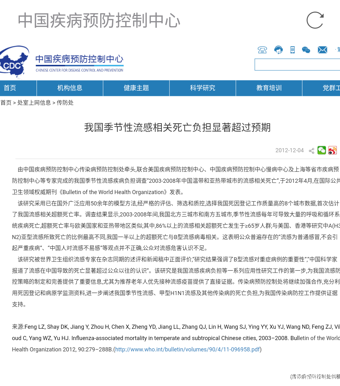 由中國疾病預防控制中心傳染病預防控制處牽頭,聯合美國疾病預防控制中心、中國疾病預防控制中心慢病中心及上海等省市疾病預防控制中心等專家完成的我國季節性流感疾病負擔調查“2003-2008年中國温帶和亞熱帶城市的流感相關死亡”,於2012年4月,在國際公共衞生領域權威期刊《Bulletin of the World Health Organization》發表。