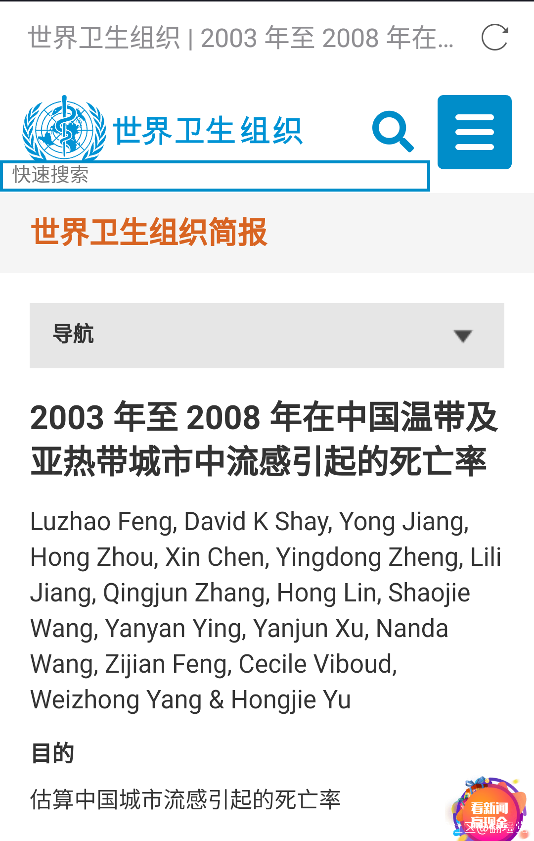 2003 年至 2008 年在中國温帶及亞熱帶城市中流感引起的死亡率Luzhao Feng, David K Shay, Yong Jiang, Hong Zhou, Xin Chen, Yingdong Zheng, Lili Jiang, Qingjun Zhang, Hong Lin, Shaojie Wang, Yanyan Ying, Yanjun Xu, Nanda Wang, Zijian Feng, Cecile Viboud, Weizhong Yang & Hongjie Yu目的