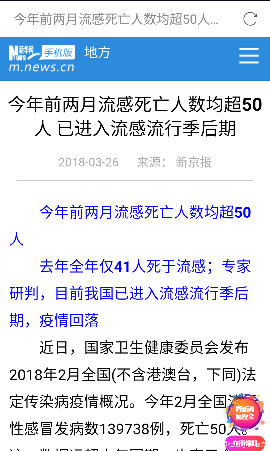 今年前兩月流感死亡人數均超50人 已進入流感流行季後期2018-03-26 來源: 新京報 今年前兩月流感死亡人數均超50人