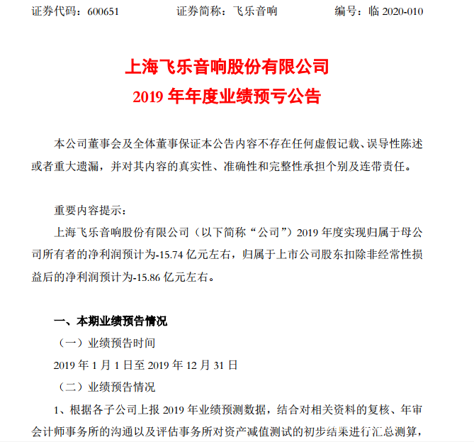 2020年1月20日晚間,飛樂音響發佈2019年業績預告稱,預計2019年淨虧損15.74億元。
