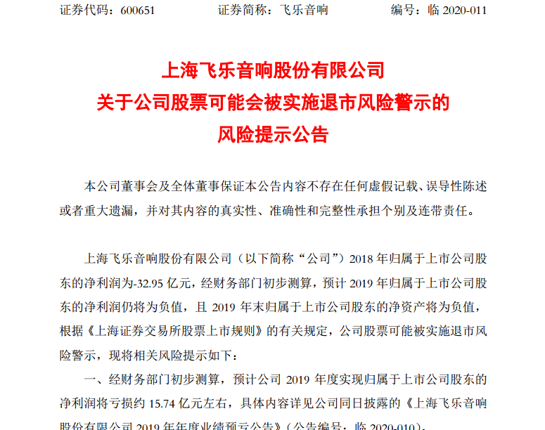 值得注意的是,飛樂音響在公佈業績預告的同一天,還發布退市風險警示。