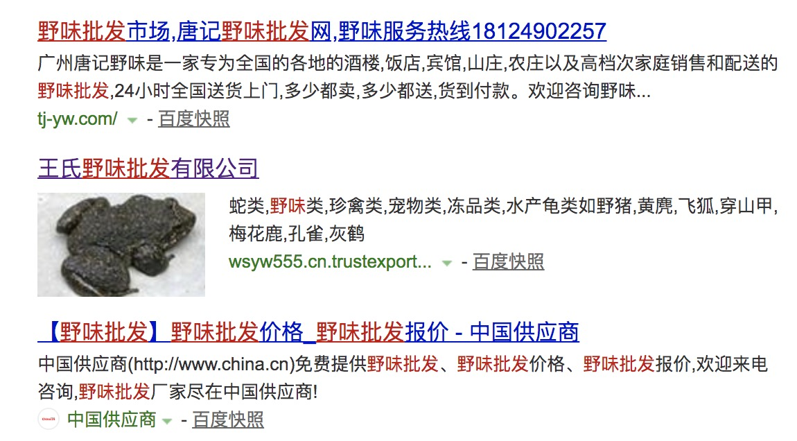 上面這個“王氏野味批發有限公司”,直接寫明自己賣“穿山甲”。想象一下,就相當於你搜“藥品批發”,看見一個網站説自己賣冰毒。