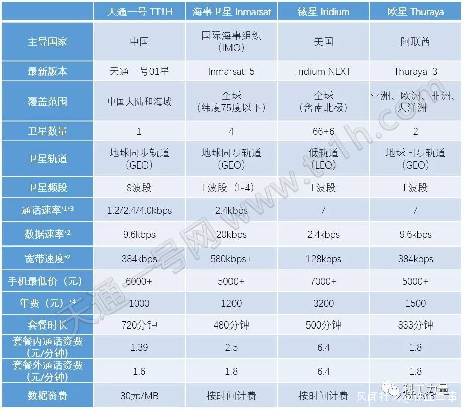 ▲ 天通一號、海事衞星電話、銥星電話、歐星電話詳細對比。
