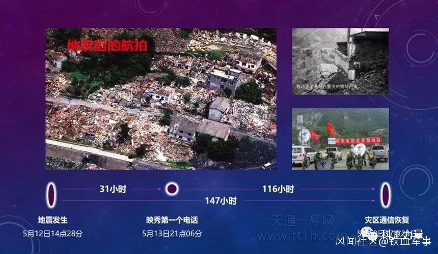 根據天通一號官網介紹,當時地面通信全部中斷,基站全塌了,電話和手機都打不通。直到31個小時後,依靠國外衞星電話,重災區映秀才和指揮部聯繫上,147小時後災區通信才恢復。