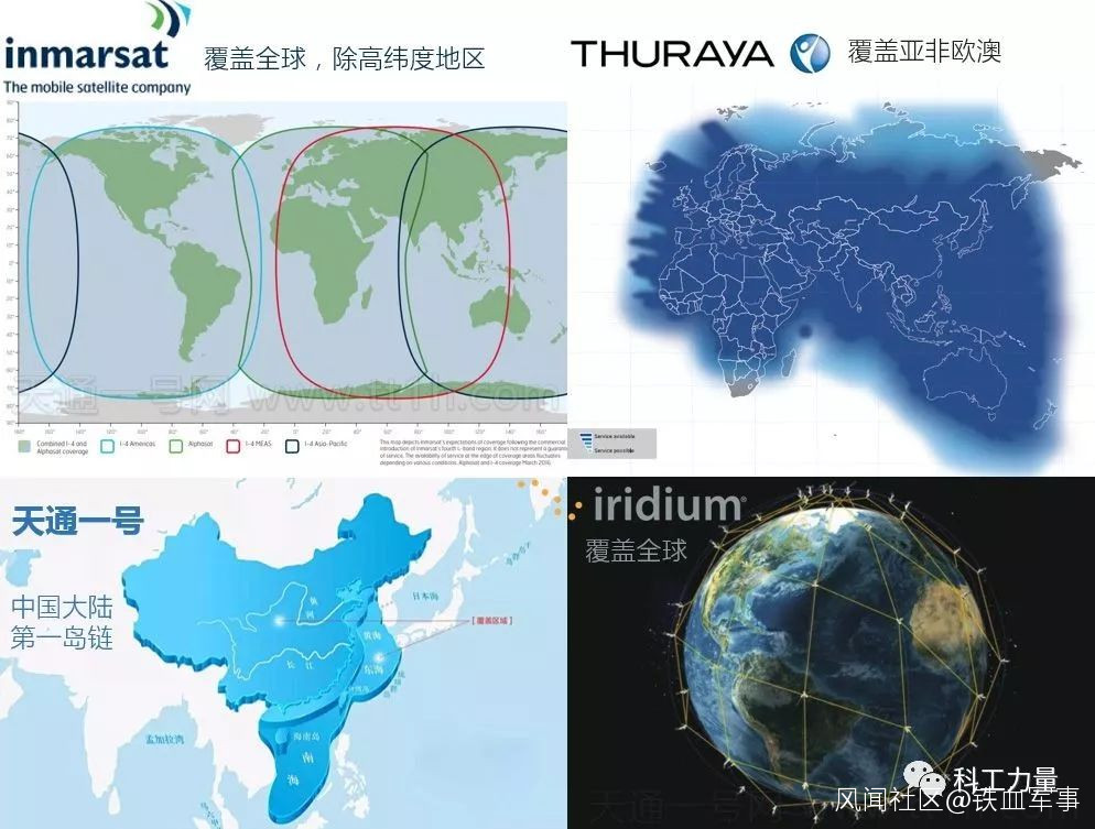 ▲ 天通一號、海事衞星電話、銥星電話、歐星電話的網絡覆蓋範圍對比
