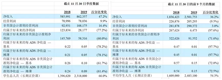 1月21日,好未來公佈其截至2019年11月30日的2020Q3季報。報告顯示,截至2019年11月30日的9個月,好未來實現淨收入25.02億美元,同比增長36.2%;實現經營利潤2.05億美元,同比下降9.5%;實現淨利潤650萬美元,去年同期為2.68億美元。