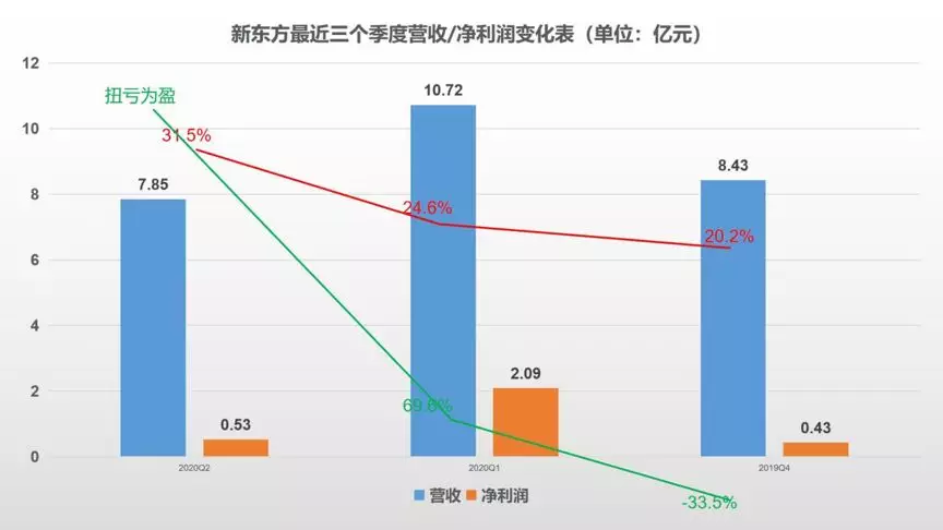 最近三個財季,新東方的營收同比增幅穩步提升,從20.2%到24.6%再到31.5%。相比於營收上的變化,其淨利潤的同比增幅更為顯著:從2019Q4的-33.5%,一躍至2020Q1的69.6%;再從69.6%,一躍至2020Q2的扭虧為盈(去年同期淨虧損為0.26億美元)。淨利潤的增長可以説是相當亮眼。