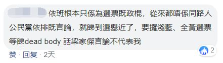 還有人直言,“這些人根本只是為選票的政棍,從來都不是同路人。‘公民黨’這段時間的言論,是因為選舉近了,要拿淺藍、全黃選票”,並補充道, “等着看楊嶽橋(“公民黨”黨魁)説梁家傑言論不代表我。”
