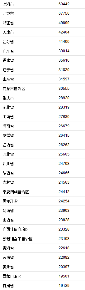 31省份2019年居民人均可支配收入。來自國家統計局網站9省份人均可支配收入超全國水平