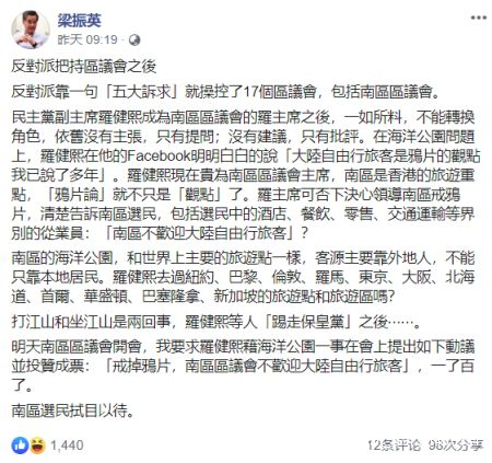 不過,身為南區區議會主席的羅健熙卻在社交媒體上發文,指責梁振英“把內地遊客當王道”,他還説,近十年來外地旅客人數十分穩定,但偏偏內地旅客增長就以倍數計,造成大量社區問題。羅還大言不慚地説,“大陸自由行旅客是鴉片”的觀點,他已説了多年。