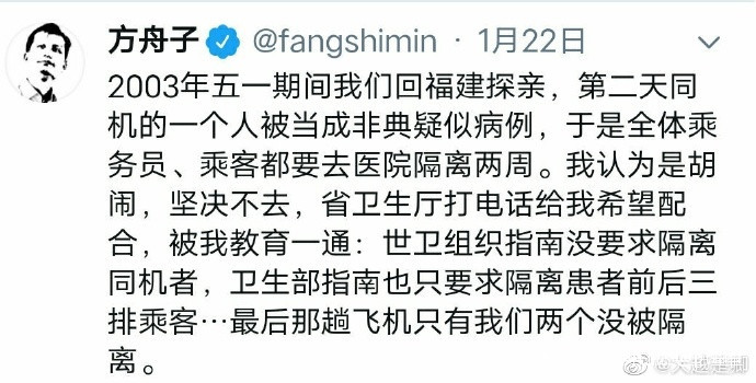 關於方舟子的言論:對於方舟子對武漢封城及鍾南山院士的權威類比的怪論。見圖----解讀,看來國內的所謂科學的衞士,已經淪落到這般境地,已經分不清防災治病與自由的關係了,只有利己的思維了,他還能挺多久?