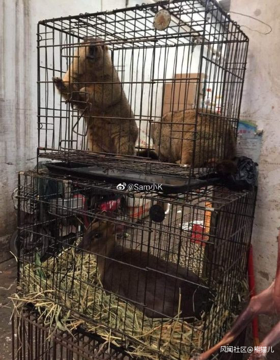上面籠子是旱獺,俗名“土撥鼠”,可傳播鼠疫(黑死病)。下面的動物是黃麂(jǐ),入籠前要挑斷腳筋防止躍出。