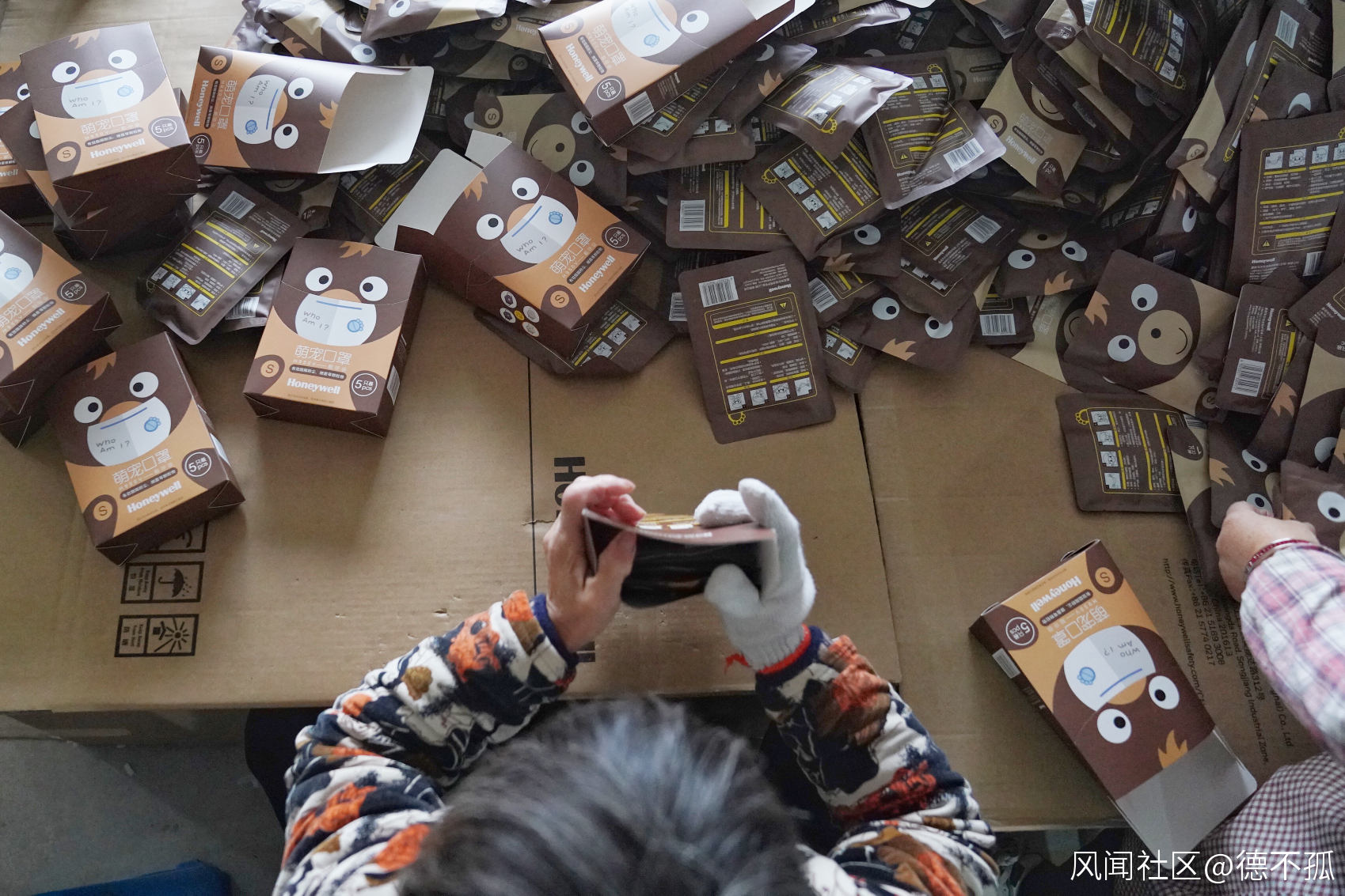 記者在廠區內看到,位於3樓的包裝車間,大量貨物正在進行最後的打包。由於時值春節,工人不夠,一些來自周邊鄉鎮的村民也自發前來幫忙。4樓的倉庫區域,一箱箱貨物已經碼放整齊。記者在包裝箱上看到,內容物均為KN95自吸過濾式防顆粒物呼吸器,也就是我們常説的KN95口罩。