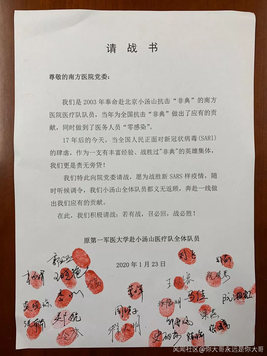 1月23日,一封來自廣州南方醫院的“請戰書”在網絡流傳,發起的是原第一軍醫大學南方醫院赴小湯山醫療隊(下稱“赴小湯山醫療隊”)。他們在“請戰書”的末尾寫道,“若有戰,召必回,戰必勝!”並印上24個紅手印和簽名。