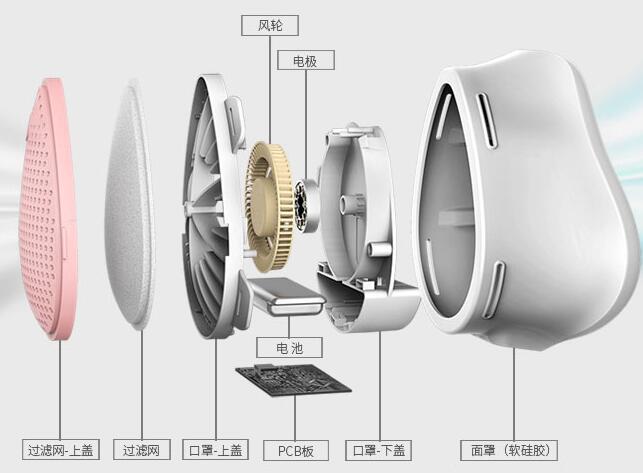 這個東西説白了就是微型新風機,用類似抽油煙機的滾筒式風扇槳葉抽氣,來解決KN95類靜電濾棉口罩吸氣阻力國標350Pa,憋氣的問題(可惜排氣時有不少產品還是靠單向呼吸閥的,並沒有智能到定時正反轉)。