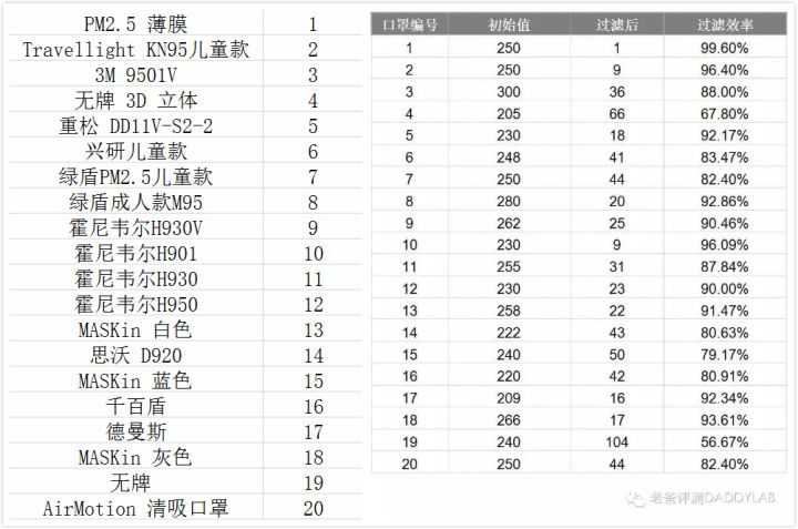 對了,PM2.5的非電動口罩他們也測試過攔截率(貌似除第一個批次的第一名他們後來説是裏面有塑料薄膜影響透氣性的,發現廠家有作弊之外,其他的應該數據是可以的?):