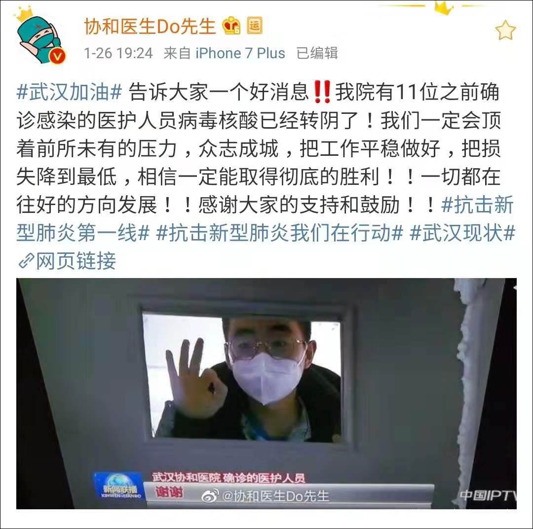 剛剛,微博認證為“華中科技大學同濟醫學院附屬協和醫院 神經外科醫生”的博主@協和醫生Do先生 透露了一個好消息,協和醫院11位之前確診感染的醫護人員病毒核酸已經轉陰了!