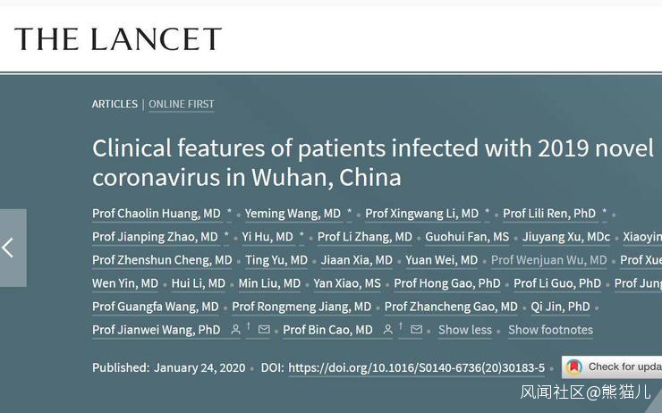 《柳葉刀》第一篇論文,從流行病學、臨牀表現、實驗室檢查、影像學特徵、治療和患者預後分析了2019年12月16日至2020年1月2日首批確診的41例感染者。