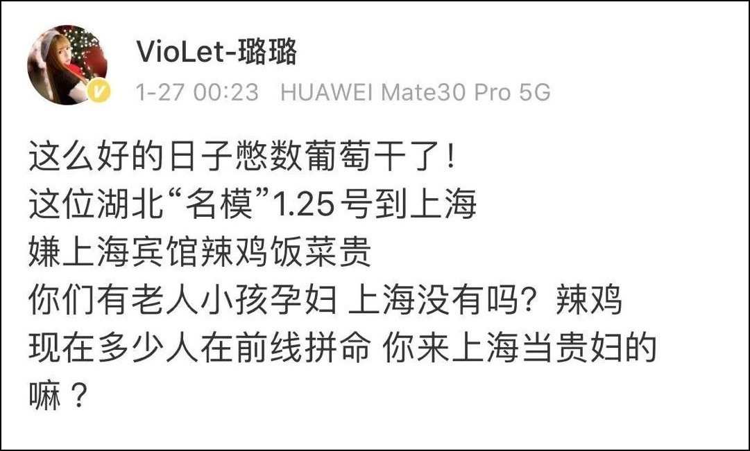 疑似湖北籍超模抱怨隔離的酒店環境差還收費,被網友罵翻了_風聞
