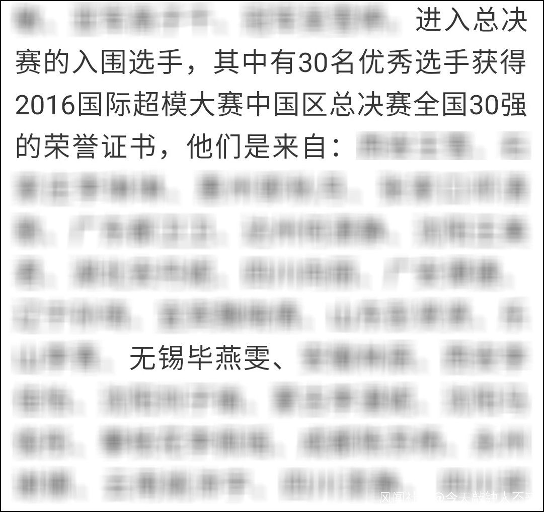 據瞭解,發佈微博的這個@畢燕雯 是2016年國際超大賽中國區星模界盛典的三十強選手。