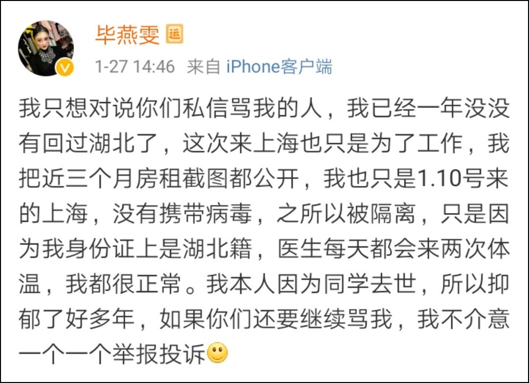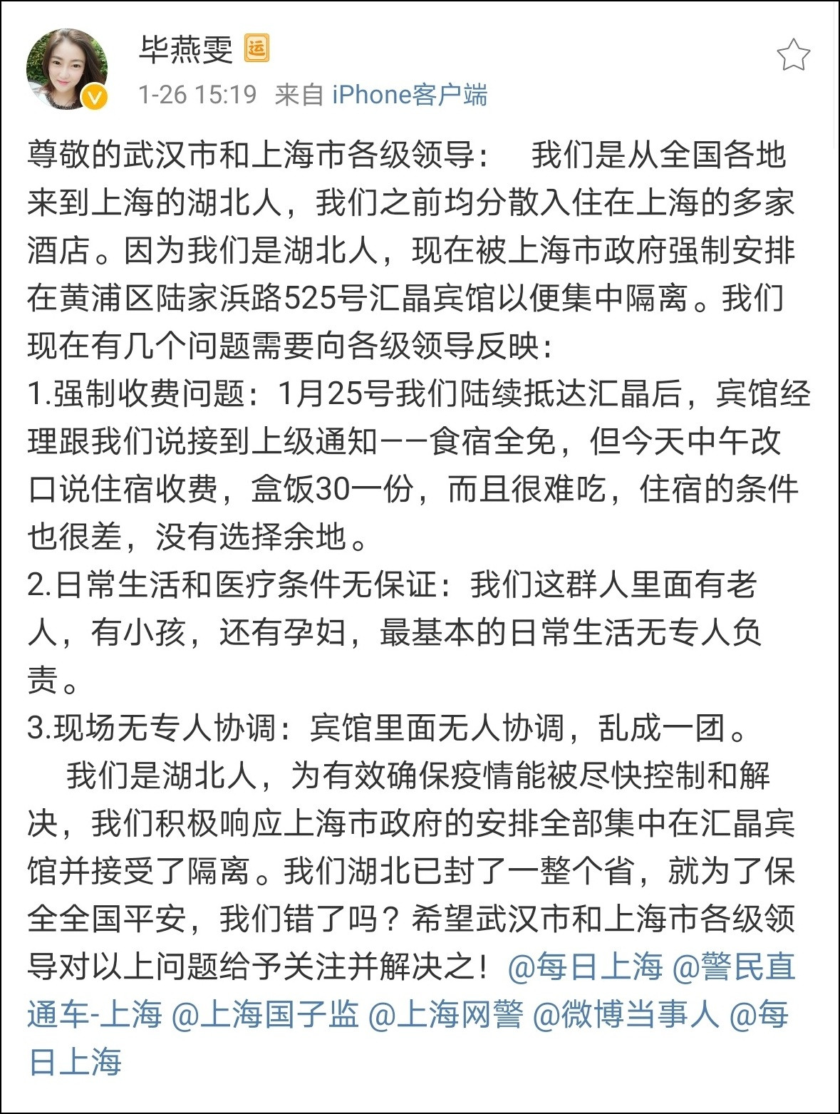 在這則微博中,@畢燕雯 還質問,自己一眾人等積極配合政府工作,甚至於“我們湖北已(經)封了一整個省,就為了保全全國平安,我們錯了嗎?”