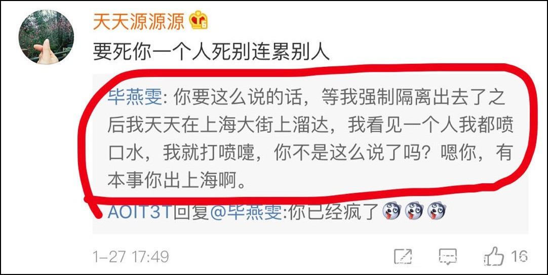 例如,因為@畢燕雯 的酒店是一日一訂,加上超模的身份,於是就有網友以“外圍女”的詞彙對其進行侮辱,她則回嗆説自己是正當職業。同時,氣急了的@畢燕雯 還説,自己隔離結束後要天天到大街上溜達,“我看見一個人我都噴口水,我就打噴嚏”。