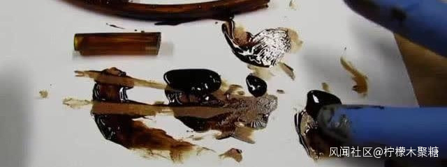 那麼,所謂“覆蓋肺細胞的煙油子”呢,其實和煙霧又不一樣。前面講煙是納米級,但是煙霧並不能長久地繚繞在肺泡表面。當它作為“煙油子”沉積下來,實際上是一種融入了焦油等物質的混合物。之前有人做過實驗,試圖把吸煙後肺部獲得的燃燒產物提取出來,最終得到下圖這團東西。如果有網友好奇心特別重,可以搜索一些嚴重的多年煙齡的肺部(乾製標本除外),可以看到很多明顯的“煙油子”,但畫面過於殘忍,希望大家慎重。