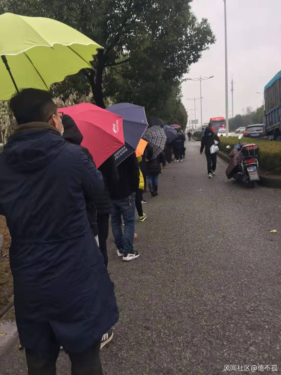 在玉川公司的廠區門口,外面雖然下着雨,但市民自覺排起了長長的隊伍,耐心等着生產線上下來的一片片口罩。就像上菜一樣,從鍋裏到口裏,口罩上似乎還留着車間裏機器的温度。
