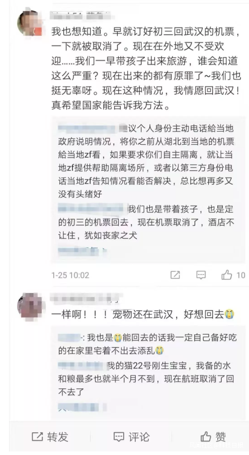 他們多是在1月中旬左右就去往外地旅遊,也定好了春節期間返程的車票。由於新型肺炎防控形勢嚴峻,武漢封城不準出,一些去往武漢的航線、鐵路也停運。