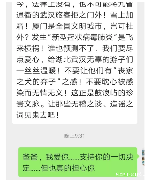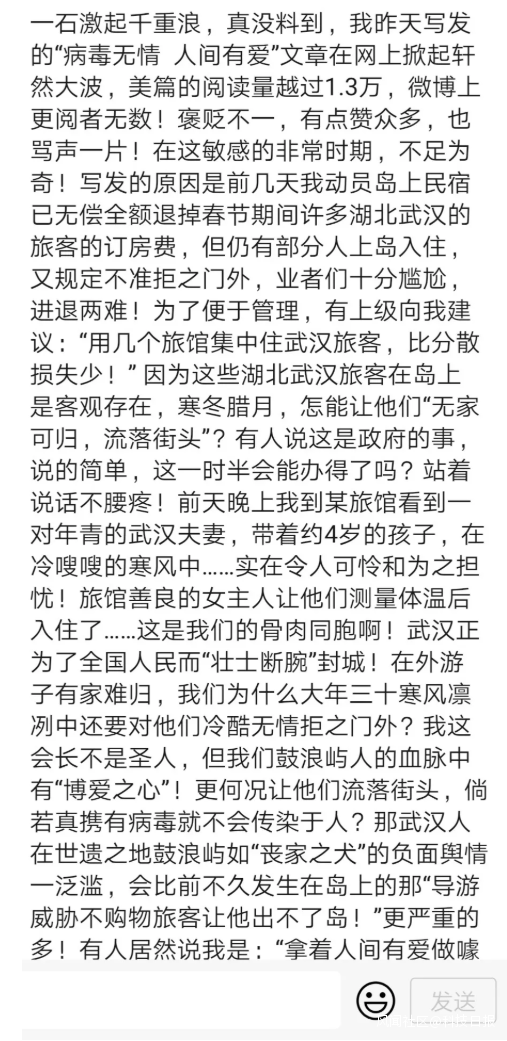 這位民宿老闆在發給女兒的微信中寫:不能讓湖北武漢無辜遊子們有喪家之犬的棄子之感。讓那些無稽之談,造謠之詞見鬼去吧。
