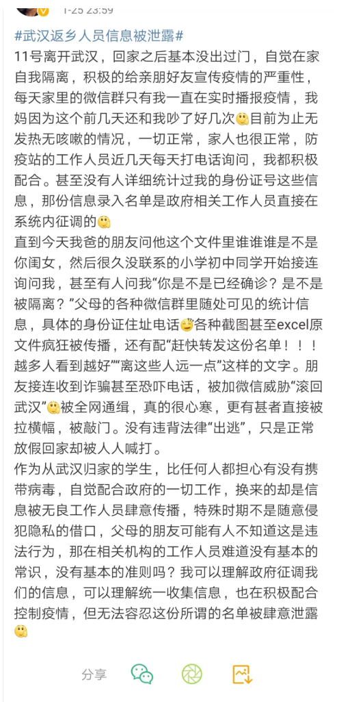 一些從武漢返鄉的大學生,在微信羣、在社交媒體上,看到了自己個人的詳細真實資料。從家庭住址到手機號、身份證號,都被裝在一份名為xx區武漢返鄉大學生的詳細的表格裏。網友轉發時,還要附上這樣的話:看看吧,小心些!有些羣裏,這樣的表格甚至乾脆被冠以“疑似感染人員名單”,在渲染恐慌情緒的同時,也將這些學生連同他的家人打入另冊。