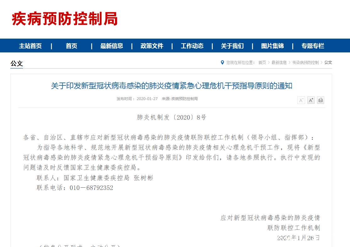 為指導各地科學、規範地開展新型冠狀病毒感染的肺炎疫情相關心理危機干預工作,現將《新型冠狀病毒感染的肺炎疫情緊急心理危機干預指導原則》印發給你們,請各地參照執行。執行中發現的問題請及時反饋國家衞生健康委疾控局。