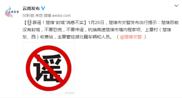 【闢謠!楚雄“封城”消息不實】1月26日,楚雄市交警發佈出行提示:楚雄目前沒有封城,不要恐慌,不要傳謠,杭瑞高速楚雄市境內程家壩、上章村(楚雄東、西)收費站,主要管控湖北籍車輛和人員。