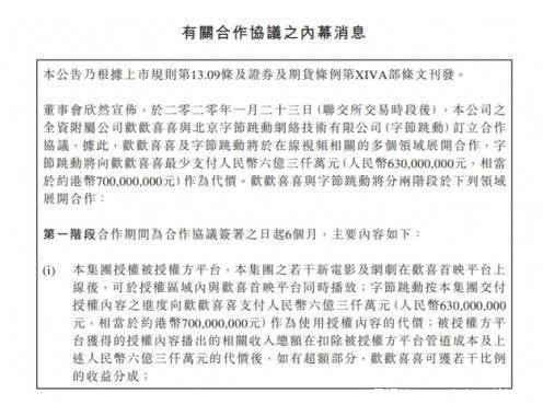 該協議中的第一階段合作期間為合作協議簽署之日起6個月,歡歡喜喜集團授權被授權方平台,集團若干新電影及網劇在歡喜首映平台上線後,可於授權區域內與歡喜首映平台同時播放;字節跳動按本集團交付授權內容的進度向歡歡喜喜支付人民幣6.3億元作為使用授權內容的代價;被授權方平台獲得的授權內容播出的相關收入總額在扣除被授權方平台管道成本及上述人民幣6.3億元的代價後,如有超額部分,歡歡喜喜可獲若干比例的收益分成。