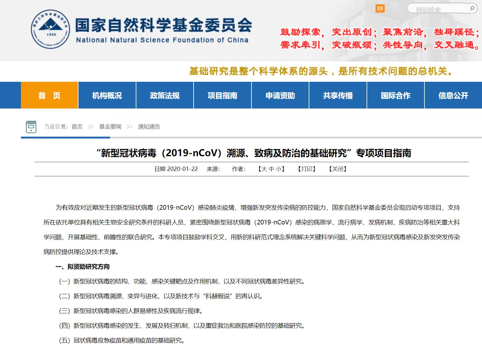 幾乎同時,國家自然科學基金委發佈“新型冠狀病毒(2019-nCoV)溯源、致病及防治的基礎研究”專項項目指南,資助期限為兩年,每個項目支持150萬元。