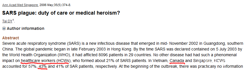 另有加拿大本國媒體的相關報道,也專門提到了43%的SARS感染者是醫護人員這一情況:https://www.theglobeandmail.com/life/health-and-fitness/health/ten-years-later-sars-still-haunts-survivors-and-health-care-workers/article9363178/