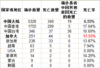 網上傳播的各種陰謀論之所以有市場,很重要的一個原因是因為大家對當年SARS在全球傳播的情況缺乏客觀的瞭解,以為它只感染中國人或者説東亞人。在假設這個想象成立的情況下,又恰逢USA正在和我國進行貿易戰,大家很容易聯想到這是否是USA實驗室製造的專門針對中國人的生物武器。USA當年無論從SARS感染人數和死亡率上看確實都很低,似乎給這種陰謀論提供了某種數據上的間接性支持,但是很多人忽略了USA的鄰國——同樣為白人主導的加拿大的情況。以下我援引世界衞生組織提供的數據,做了一個簡單的表格(各位也可參見維基百科援引相同數據來源製作的表格):