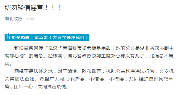 新浪微博網傳“武漢華南海鮮市場老闆是餘甜,她的公公是湖北省政協副主席鄭心穗”的消息。經核實,湖北省政協原副主席鄭心穗沒有兒子,此消息不屬實。