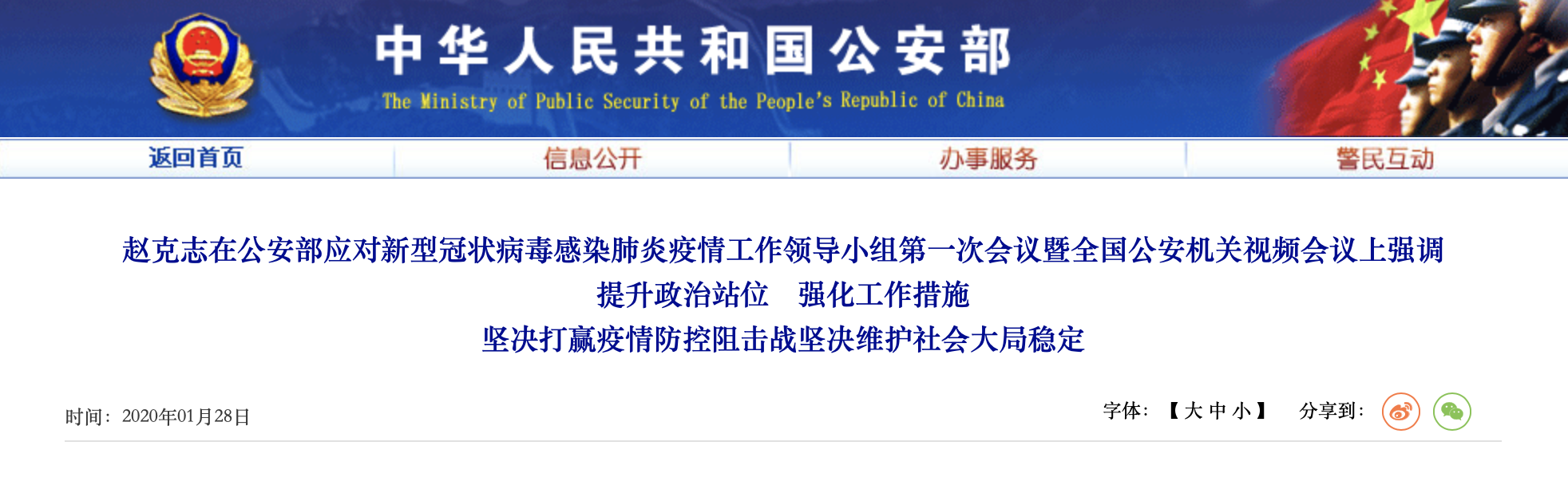 國務委員、公安部黨委書記、部長趙克志1月28日在公安部應對新型冠狀病毒感染肺炎疫情工作領導小組第一次會議暨全國公安機關視頻會議上強調,要深入學習貫徹習近平總書記關於新型冠狀病毒感染肺炎疫情防控工作的重要指示和中央應對新型冠狀病毒感染肺炎疫情工作領導小組會議精神,增強“四個意識”、堅定“四個自信”、做到“兩個維護”,堅持把人民羣眾生命安全和身體健康放在第一位,把疫情防控作為當前最重要的工作、最緊迫的任務來抓,在各級黨委和政府的領導下,提升政治站位,強化工作措施,嚴明戰時紀律,紮實抓好防風險、護安全、戰疫情、保穩定各項措施的落實,堅決把黨中央的各項重大決策部署落到實處,堅決打贏疫情防控阻擊戰,堅決維護社會大局穩定。