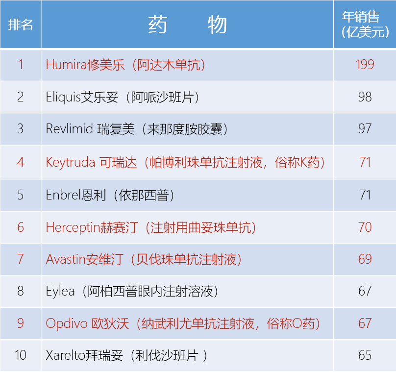 表1. 2019年全球藥物銷售排行榜,紅色為抗體藥物**[1]**