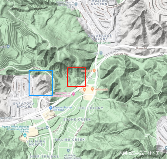 而從航線圖中我們可以看到,在科比的飛機偏離航線的位置(紅框),正好位於薩拉託加山(藍框)前的山坳口的位置,很可能就是受到了這種氣流的影響(或者因能見度不足,導致必須緊急爬升避山)。