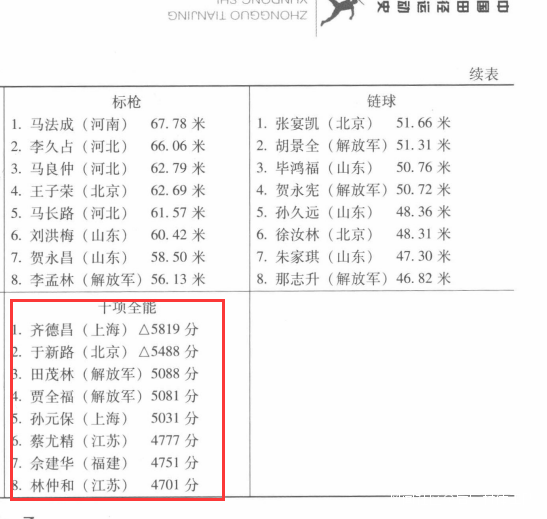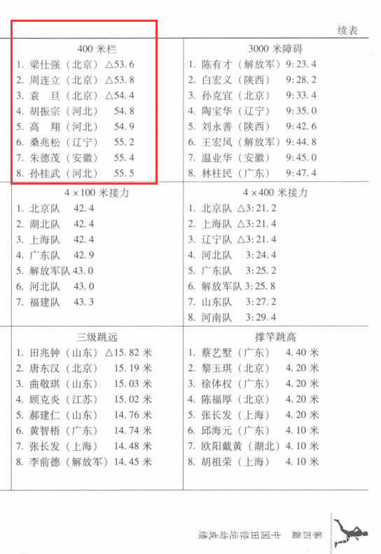 在好奇心的驅使下,我們在《中國田徑運動史》這本書裏找到了首屆全運會田徑項目的成績,根據這本書的紀錄,第一屆全運會400米欄的冠軍的確並不是鍾南山,而是中國初代欄王梁仕強,當時他以53.6秒的成績奪冠,而鍾南山甚至沒有出現在前八名裏。此外,十項全能的冠軍獲得者是來自上海的齊德昌,在成績表中同樣沒有鍾南山的名字。