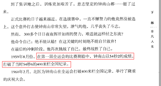 《鍾南山傳》這樣寫道:“在最後的衝刺階段,他再次挑戰了自己,最終戰勝了自己。1958年8月份,在第一屆全運會的比賽測驗中,鍾南山以54秒2的成績,打破了當時54秒6的400米欄全國紀錄。”