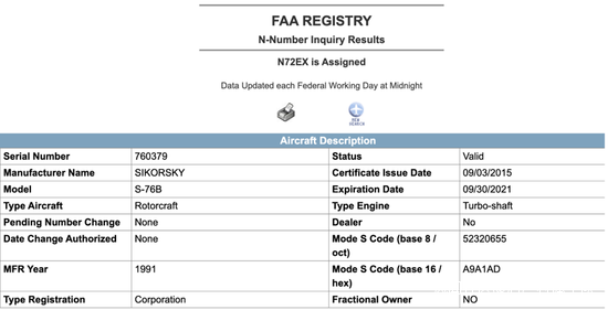 這架飛機於1991年製造,屬於奢華高端款直升機,很多富豪都十分偏愛。N72EX這架飛機更是被譽為“曼巴直升機”,因為它是科比多年來的心水座駕。在2016年退役之夜,科比打完比賽就是乘坐它離開了斯台普斯中心。而他也經常用它招待好友,包括凱瑞-厄文、私人訓練師菲爾-漢迪等人。他的妻女也經常使用它來出行。
