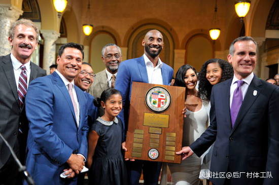 在科比墜機後,洛杉磯市政廳於1月26日晚8點24分亮燈哀悼,紫金兩色映照着古色古香的建築,讓人記起就在三年前的夏天,科比帶着一家人來到這裏,接受了洛杉磯市*“科比-布萊恩特日”*的特別榮譽。