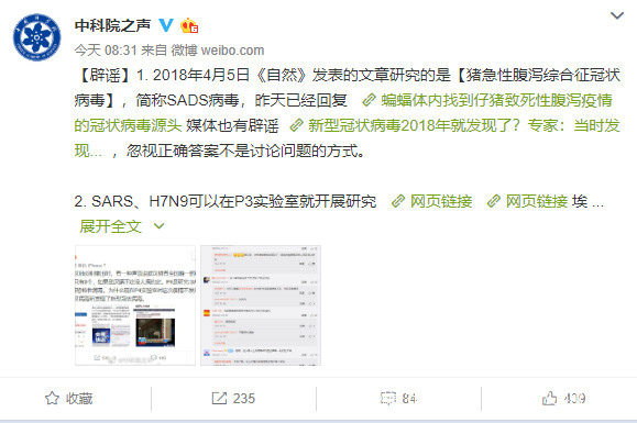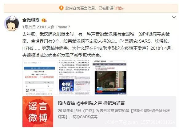 日前,微博名為@金微觀察 的網友在微博發文質疑,**新型冠狀病毒是否早已被發現,武漢P4級病毒實驗室為何不出面發聲?**對此,@中科院之聲 今早發文進行闢謠。