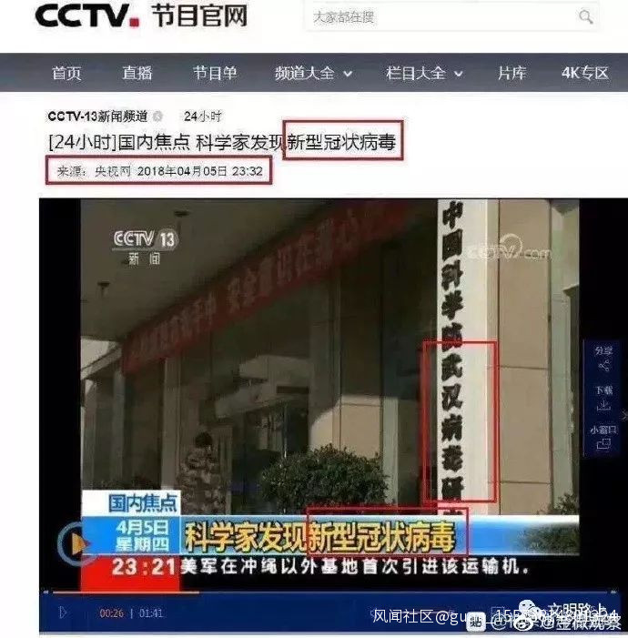 2018年4月,央視報道武漢病毒所發現了新型冠狀病毒。