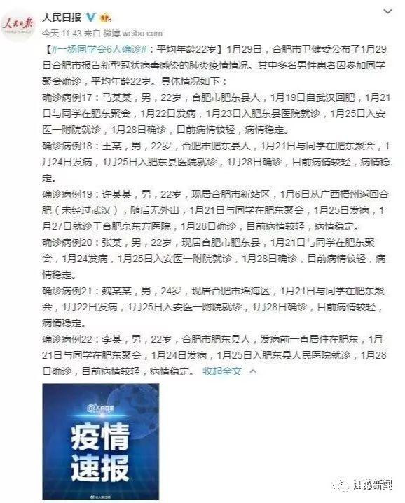 就在今天,合肥市衞健委公佈了1月29日合肥市報告新型冠狀病毒感染的肺炎疫情情況,其中6人因參加同學聚會確診 ,平均年齡22歲引發網友關注。