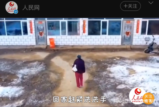 就在老奶奶抬頭張望的時候,無人機“説話”了:“老奶奶別看了,這是咱們村的無人機啊。你不戴口罩就不要出去,不要亂跑。記得趕緊回家,回家洗洗手,注意一下衞生。”